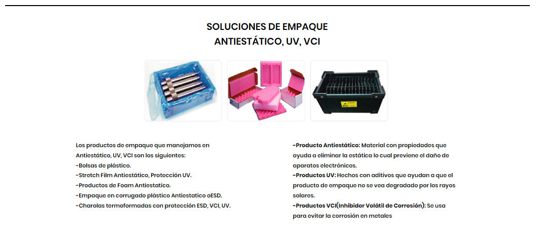 Los productos de empaque que manejamos en antiestático UV, VCI, son los siguientes: