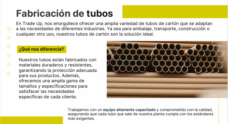 En Trade Up, nos enorgullece ofrecer una amplia variedad de tubos de cartón que se adaptan a las necesidades de diferentes industrias. Ya sea para embalaje, transporte, construcción o cualquier otro uso, nuestros tubos de cartón son la solución ideal.